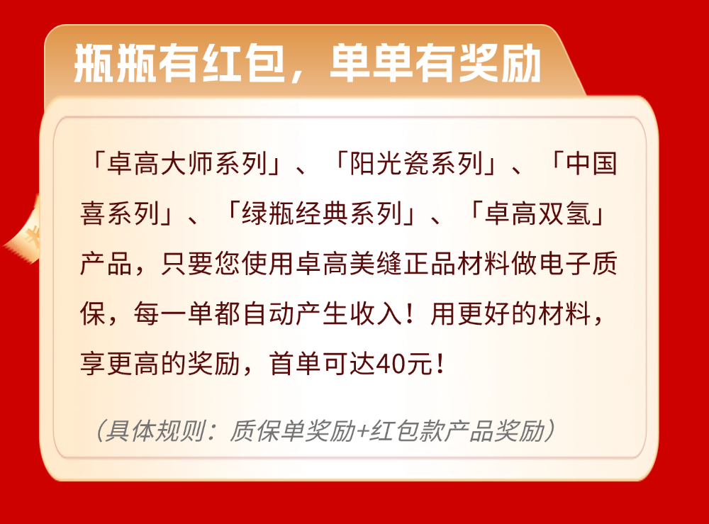 卓高美缝喊你领红包啦!用卓高电子质保单,单单有奖励!